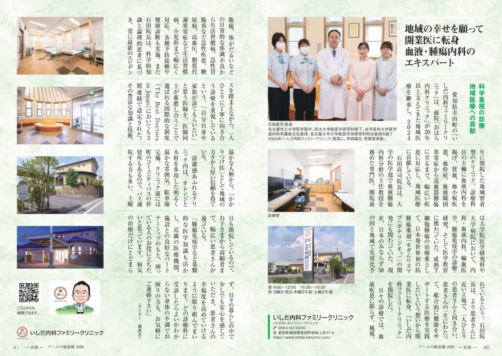 このたび、いしだ内科ファミリークリニック 院長・石田高司先生のコラムが情報誌『ブームの最前線 2026年度版』の「最前線医療の現場と頼れる専門ドクター」に掲載されましたのでお知らせいたします。