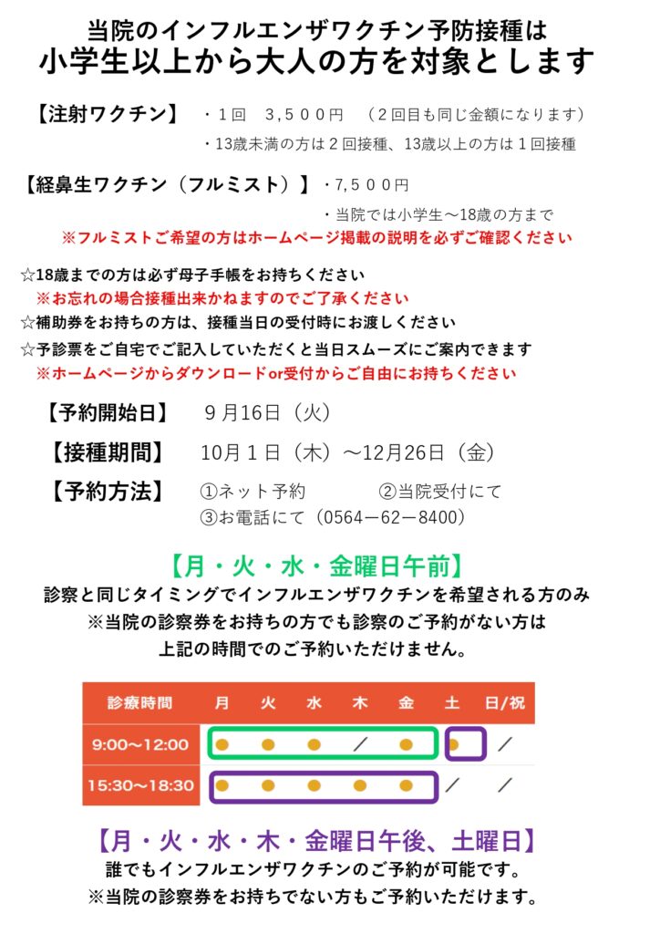 当院では、2025年10月1日よりインフルエンザ予防接種を開始いたします。